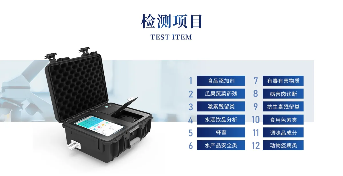 食品添加劑:二氧化硫、雙氧水、亞硝酸鹽、硝酸鹽、苯甲酸鈉、山梨酸鉀、糖精鈉、甜蜜素、木耳硫酸鎂等有毒有害物質:甲醛、吊白塊、硼砂、過氧化苯甲酰、溴酸鉀、羅丹明B、三聚氰胺、蘇丹紅、工業堿、尿素、明礬等果蔬:農藥殘留(酶抑制率法)病害肉診斷:組胺、揮發性鹽基氮;重金屬含量:鉛、鎘、鉻、汞、砷、錫、鎳、鋁等;食用油脂: 過氧化值、酸價等瘦肉精激素類(獸藥):鹽酸克倫特羅、沙丁胺醇、萊克多巴胺、己烯雌酚等抗生素殘留類(獸藥):四環素類、硝基呋喃類、磺胺類、β-興奮劑類、沙星類、磺胺類、喹諾酮類,甲砜霉素,氟苯尼考,金剛烷胺、替米考星、慶大霉素、林可霉素、鏈霉素、恩諾沙星、環丙沙星、頭孢啦啶、青霉素、阿莫西林等真菌毒素類:食用油、糧食及飼料中黃曲霉毒素B1、黃曲霉毒素總量,奶中黃曲霉毒素M1、嘔吐毒素、玉米赤霉烯酮、赭曲霉毒素A、T2毒素、伏馬毒素等;水酒飲品分析:酒中甲醇、乙醇、乳品及牛奶中蛋白質,調味品成分:食醋的總酸、醬油的總酸、芝麻油純度、谷氨酸鈉、醬油氨基酸態氮、食鹽中亞鐵氰化鉀、食鹽中碘等食用色素類:紅色色素(胭脂紅、莧菜紅、赤蘚紅、誘惑紅)、黃色色素(檸檬黃、日落黃)、藍色色素(亮藍)等動物疫病類:禽流感、新城疫、牛羊口蹄疫、牛羊結核病、牛羊包蟲、牛羊布病、小反芻獸、豬藍耳病毒、豬瘟病毒、豬偽狂犬病毒、豬細小、豬圓環、犬細小病毒、犬瘟熱病毒、犬狂犬病毒等;蜂蜜成分:果糖和葡萄糖、蔗糖、淀粉酶、酸度等水產品安全類:孔雀石綠、氯霉素、呋喃妥因、呋喃西林、呋喃它酮、呋喃唑酮等蛋類藥物殘留:氯霉素,四環素,磺胺類,喹諾酮類,呋喃西林,呋喃它酮,呋喃妥因,呋喃唑酮,氟苯尼考,阿莫西林、頭孢氨芐、紅霉素、鏈霉素等