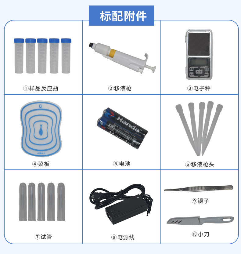 內置強大的數(shù)據(jù)庫,可在儀器上直接選擇樣品名稱、檢測指標、送檢單位等信息,也可在儀器上直接編輯錄入樣品名稱、檢測指標、送檢單位等信息并保存進樣品數(shù)據(jù)庫。