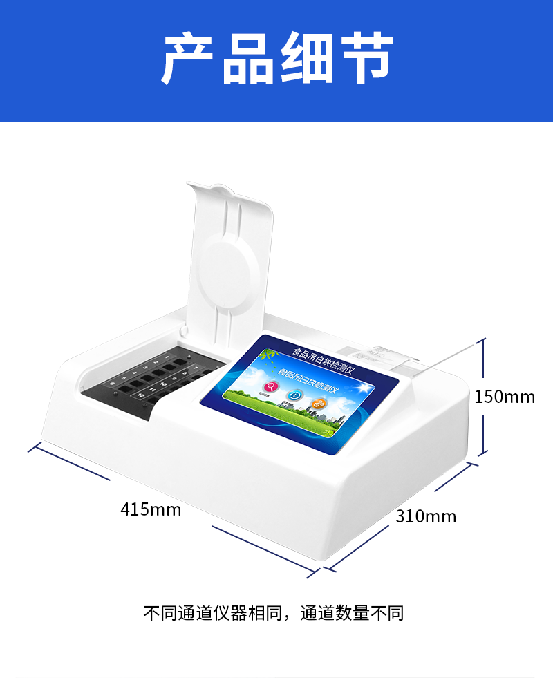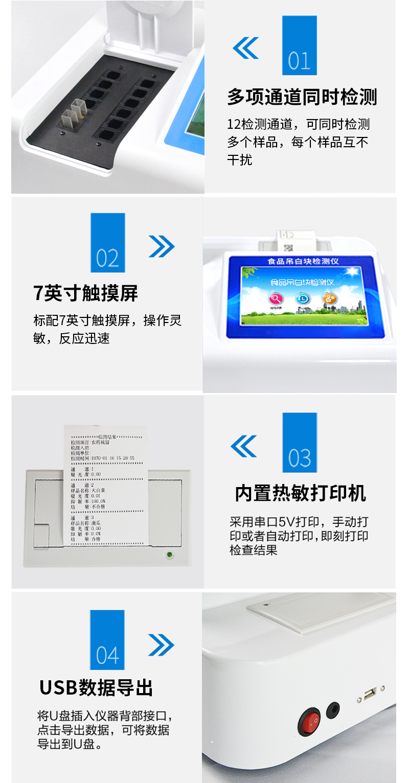 儀器采用臺式一體化系統檢測技術,將分光光度模塊、新型農殘檢測模塊、數字化管理模塊、無線通訊模塊高度集成于一體,支持檢測200種食品安全檢測項目,同時預留升級檢測方法。儀器檢測模塊標準化、智能化,可隨意自由組合。檢測箱體內置多個標準檢測單元,檢測模塊可以調整配置。儀器采用全新安卓智能系統,主控芯片采用 ARM Cortex-A7,RK3288/4核處理器,10.1寸高清液晶觸摸豎屏,更加**的UI交互界面,運轉快捷;儀器配備無線通信模塊: 4G(APN)通訊模塊、Wifi模塊,藍牙傳輸,同時具有雙USB接口以及RJ45接口能以多種方式實現數據保存和數據傳輸功能。創新檢測模式:★檢測通道:≥12通道;采用精密旋轉比色池設計,使用同芯片同光源校準精度,解決不同光源之間的誤差值。1-12通道間誤差0.1%。(***:**202022821055.2)★儀器具有自動識別比色皿檢測功能,即:將樣品比色皿放入儀器后,點擊樣品檢測,儀器自動識別比色皿進行通道檢測。進口高精光源:高精度進口四波長冷光源,通道配置 410、520、590、630nm 波長光源,一個光源芯片驅動一個光源,誤差極小,每臺設備單獨**校準光源,**比對,同時參照四種不同波段光源全方位覆蓋市面上99%的農殘食品項目檢測。智能化操作系統:便捷操作系統:設備檢測時可在同一檢測界面自動對應相關檢測通道一次性選擇1-12個樣品名稱,無須退出界面,節省操作時間。數據集成系統:設備首頁自動統計檢測數據包含:周檢測數據、月檢測數據,全部檢測總數量,均包含檢測總數,合格數,不合格數,以及相關柱形分析圖,對各項檢測數據清晰掌握,無需電腦查詢,更加快捷直觀。項目預設系統:支持添加單個及多個相同或不相同的任務預設,一鍵快速調取,每一個任務分別可以設置不同的樣品、批次、編號、來源、備注、抽樣信息、檢測信息、受檢信息、復核信息等更多信息。無縫鏈接平臺和APP實時查看下發任務。數據監管系統:同步對接監管平臺,數據可局域網和互聯網數據上傳,檢測結果可選擇直接傳至食品安全監管平臺。集成OSS輸出存儲服務、區分設備定向管理應用,進行區域食品安全監管及大數據分析處理與數據統計,檢測區域食品安全長短期動態,達到食品安全問題預估、預警。自定義打印系統:內置全新打印系統,新創自定義打印方式,可按需靈活設置開啟或關閉:產品合格證(國家農業部標準要求),二維碼,抽樣信息、檢測信息,受檢信息、復核信息、抽樣日期、檢測日期等信息的打印。系統遠程更新功能:可定向分客戶分儀器更新系統,按照不同客戶后期實際需求添加項目,無需機器返廠,即可遠程實時升級全新系統,節省時間成本及避免運輸造成設備損壞。儀器主機采用一體化防水、抗壓、防撞擊、防腐蝕箱體設計,同時配備交直流供電,可連接車載電源,可選配大容量充電鋰電池,滿足現場野外檢測需求。安全證書,放心保障:儀器具有中國計量科學研究院校準證書,權威認證。