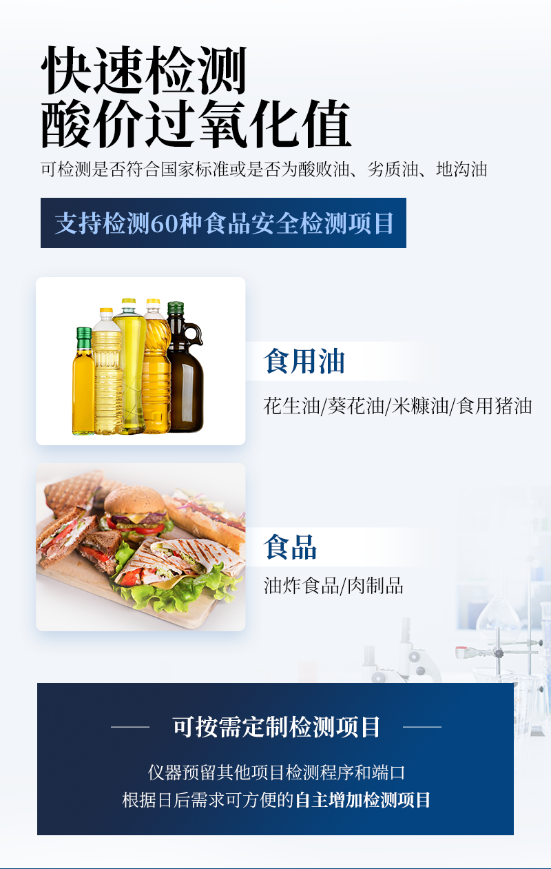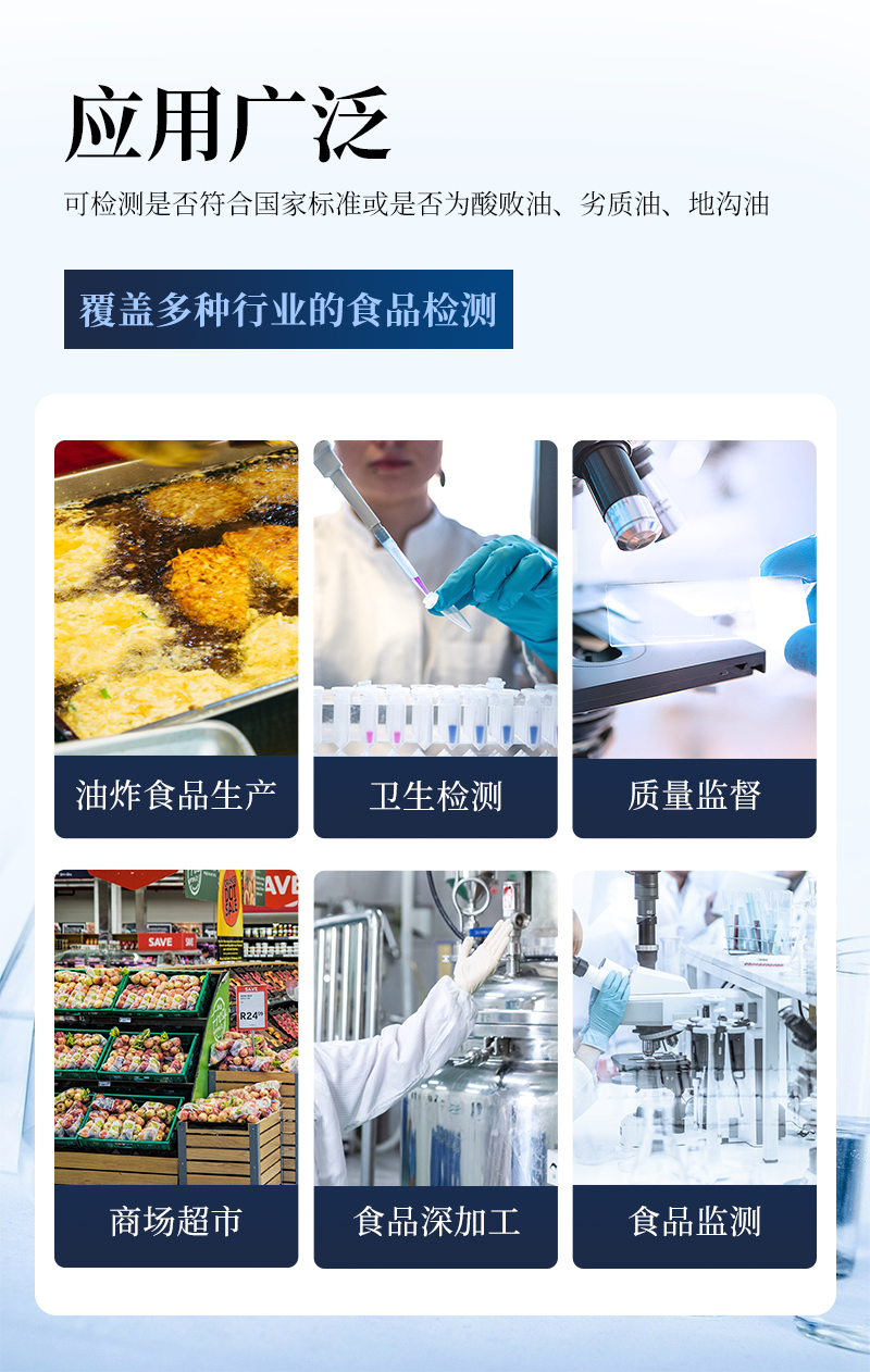 該過酸價氧化值檢測儀為集成化食品安全快速檢測分析設備,目前已于市場監管局、食用油加工企業、學校食堂、衛生部門、配送中心、商場超市等單位廣泛使用。