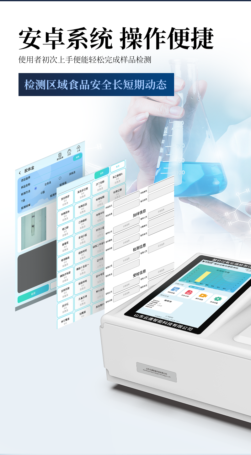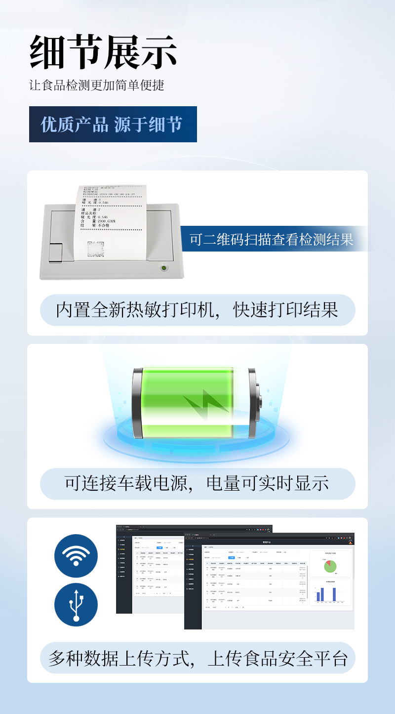 1、儀器采用臺式一體化系統檢測技術,將分光光度模塊、膠體金檢測模塊、新型農殘檢測模塊、數字化管理模塊、無線通訊模塊高度集成于一體,支持檢測200種食品安全檢測項目,同時預留升級檢測方法。2、儀器檢測模塊標準化、智能化,檢測項目可隨意自由組合。檢測箱體內置多個標準檢測單元,檢測模塊可以調整配置。3、顯示屏幕:儀器采用10.1英寸豎向液晶觸摸屏顯,搭配運行安卓智能操作系統,主控芯片采用ARM Cortex-A7,RK3288/4核處理器,主頻1.88Ghz,操作方便,性能更強。4、檢測通道:≥12通道;采用精密旋轉比色池設計,使用同芯片同光源校準精度,解決不同光源之間的誤差值,更加準確**。(1-12通道間誤差0.1%,***:**202022821055.2)5、儀器光源:高精度進口四波長冷光源,每個通道均配置 410、520、590、630nm 波長光源,標配**的光路切換裝置,專利光路切換功能可實現64波長,并且所有檢測項目可實現所有通道同時檢測。6、設備可一鍵校準,自動保存校準數據,自動對比校驗,得到精準光源,采用Android SP存儲數據,光源數據永不丟失,方便每一次使用。7、通訊接口:配備無線通信模塊、4G(APN)通訊模塊、藍牙傳輸,同時具有雙USB接口以及RJ45網線接口,可以多方式實現數據保存及數據傳輸。8、存儲方式:支持U盤存儲,標準USB接口,免驅動安裝。檢測結果存儲容量20萬條以上,可生成Excel表格進行拷貝,并具有登錄保護功能。9、智能化操作系統:9.1、操作系統:儀器可在同一檢測界面自動對應相關檢測通道,一次性選擇1-12個樣品名稱,無需退出界面,節省操作時間。并可以對每個通道屬性和樣品信息單獨進行編輯,例如送檢單位、人員,檢測人員等,打印時勾選打印顯示。9.2、數據集成系統:設備首頁自動匯總分析檢測數據,包含:周檢測數據、月檢測數據,全部檢測總數量,均包含檢測總數,合格數,不合格數,以及相關柱形分析圖,各項檢測數據一目了然,無需電腦查詢,更加快捷直觀。9.3、數據庫系統:十幾項數據庫分類管理儀器:包含項目類型、項目數據、檢測數據、歷史記錄、國標信息、曲線信息、采樣信息、檢測信息、受檢信息、復核信息、圖表信息、光源校準信息、打印樣式信息、樣品庫信息等等,數據庫之間互相協調聯動保證數據的真實完整性。同時產品數據庫以及歷史檢測記錄支持一鍵檢索功能。9.4、限量規判系統:具有限量查詢、添加物質合規判定系統。檢測出結果后,系統自動調用系統數據庫中相關國標進行比對判定,客觀顯示判定結果是否合格。9.5、項目預設系統:儀器具有任務預設模塊,一鍵提前預設,給出方便快捷的新檢測方案,每一個任務分別可以設置不同的樣品、批次、編號、來源、備注、抽樣信息、檢測信息、受檢信息、復核信息等更多信息。樣品送檢時一鍵調取保存信息,并可多次調取,大大提高檢測效率。9.6、數據監管系統:同步對接監管平臺,數據可局域網和互聯網數據上傳,檢測結果可選擇直接傳至食品安全監管平臺。進行區域食品安全監管及大數據分析處理與數據統計,檢測區域食品安全長短期動態,達到食品安全問題預估、預警。9.7.1、全新打印系統:內置全新打印機,新創自定義打印方式,可按需靈活勾選控制:產品合格證(國家農業部標準要求),二維碼,抽樣信息、檢測信息,受檢信息、復核信息、抽樣日期、檢測日期等信息的打印。9.7.2、A4紙版本報告打印功能(選配):設備擁有兩種結果展示方式,可以自動生成A4打印模板和小票打印模板兩種樣式,可通過WiFi及網線等方式鏈接外置打印機可進行打印。10、供電模式:儀器交直流兩用,直流12V供電,可連接車載電源,可配6ah大容量充電鋰電池,電量可實時顯示,方便戶外流動測試。11、膠體金檢測模塊:采用單通道CMOS成像處理技術及膠體金免疫層析技術,可讀取膠體金卡數據,自動采集、處理分析,將檢測結果顯示,并可根據參考限值自動判斷檢測結果,可檢測常見的獸藥殘留、生物毒素、抗生素、違禁添加物等。11.1、探測技術:CMOS成像探測;11.2、檢測通道:1個通道;11.3、檢測方式:消線法和比色法;11.4、顯示模式:陰性或陽性;11.5、曲線形式:直插式掃描方式,顯示金標卡圖像,實時生成、識別CT曲線圖,無需手動調整,完成檢測后自動退出檢測卡。兼容市場上其他金標卡,使用耗材不受限制。12、儀器具備遠程升級功能,可定向分客戶分儀器更新,開機后自動更新,并可持續性免費更新系統版本,無需像傳統產品返廠更新,節省時間及人力成本并避免了物流運輸返廠升級導致設備損壞的潛在風險。