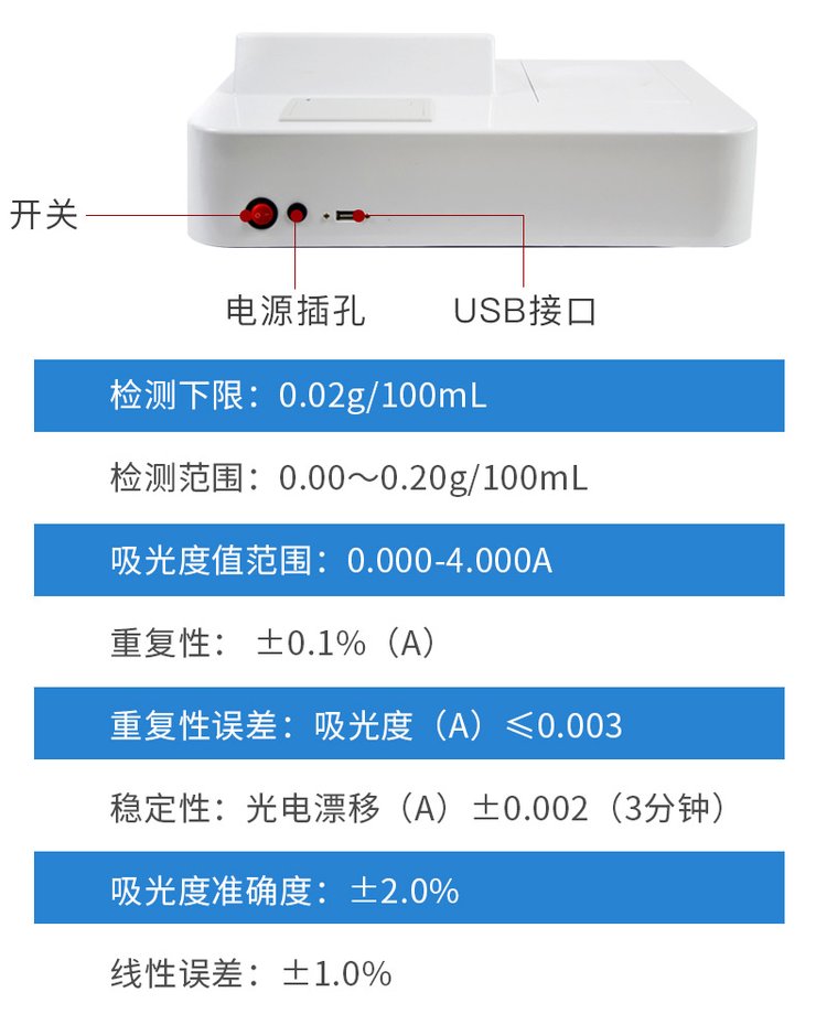 儀器采用臺式一體化系統檢測技術,將分光光度模塊、新型農殘檢測模塊、數字化管理模塊、無線通訊模塊高度集成于一體,支持檢測200種食品安全檢測項目,同時預留升級檢測方法。儀器檢測模塊標準化、智能化,可隨意自由組合。檢測箱體內置多個標準檢測單元,檢測模塊可以調整配置。儀器采用全新安卓智能系統,主控芯片采用 ARM Cortex-A7,RK3288/4核處理器,10.1寸高清液晶觸摸豎屏,更加**的UI交互界面,運轉快捷;儀器配備無線通信模塊: 4G(APN)通訊模塊、Wifi模塊,藍牙傳輸,同時具有雙USB接口以及RJ45接口能以多種方式實現數據保存和數據傳輸功能。創新檢測模式:★檢測通道:≥12通道;采用精密旋轉比色池設計,使用同芯片同光源校準精度,解決不同光源之間的誤差值。1-12通道間誤差0.1%。(***:**202022821055.2)★儀器具有自動識別比色皿檢測功能,即:將樣品比色皿放入儀器后,點擊樣品檢測,儀器自動識別比色皿進行通道檢測。進口高精光源:高精度進口四波長冷光源,通道配置 410、520、590、630nm 波長光源,一個光源芯片驅動一個光源,誤差極小,每臺設備單獨**校準光源,**比對,同時參照四種不同波段光源全方位覆蓋市面上99%的農殘食品項目檢測。智能化操作系統:便捷操作系統:設備檢測時可在同一檢測界面自動對應相關檢測通道一次性選擇1-12個樣品名稱,無須退出界面,節省操作時間。數據集成系統:設備首頁自動統計檢測數據包含:周檢測數據、月檢測數據,全部檢測總數量,均包含檢測總數,合格數,不合格數,以及相關柱形分析圖,對各項檢測數據清晰掌握,無需電腦查詢,更加快捷直觀。項目預設系統:支持添加單個及多個相同或不相同的任務預設,一鍵快速調取,每一個任務分別可以設置不同的樣品、批次、編號、來源、備注、抽樣信息、檢測信息、受檢信息、復核信息等更多信息。無縫鏈接平臺和APP實時查看下發任務。數據監管系統:同步對接監管平臺,數據可局域網和互聯網數據上傳,檢測結果可選擇直接傳至食品安全監管平臺。集成OSS輸出存儲服務、區分設備定向管理應用,進行區域食品安全監管及大數據分析處理與數據統計,檢測區域食品安全長短期動態,達到食品安全問題預估、預警。自定義打印系統:內置全新打印系統,新創自定義打印方式,可按需靈活設置開啟或關閉:產品合格證(國家農業部標準要求),二維碼,抽樣信息、檢測信息,受檢信息、復核信息、抽樣日期、檢測日期等信息的打印。系統遠程更新功能:可定向分客戶分儀器更新系統,按照不同客戶后期實際需求添加項目,無需機器返廠,即可遠程實時升級全新系統,節省時間成本及避免運輸造成設備損壞。儀器主機采用一體化防水、抗壓、防撞擊、防腐蝕箱體設計,同時配備交直流供電,可連接車載電源,可選配大容量充電鋰電池,滿足現場野外檢測需求。安全證書,放心保障:儀器具有中國計量科學研究院校準證書,權威認證。