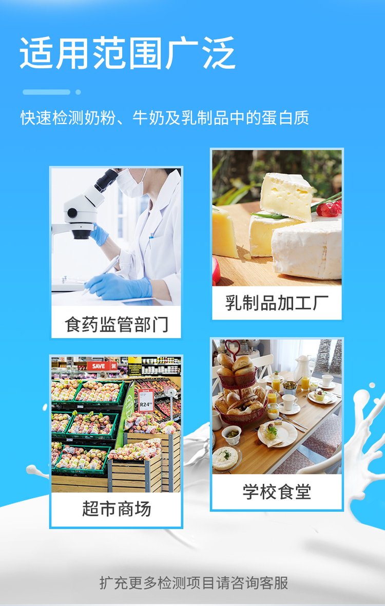 可快速檢測奶粉、牛奶及乳制品中的蛋白質,儀器預留其他項目檢測程序和端口,根據日后需求可方便的自主增加檢測項目。