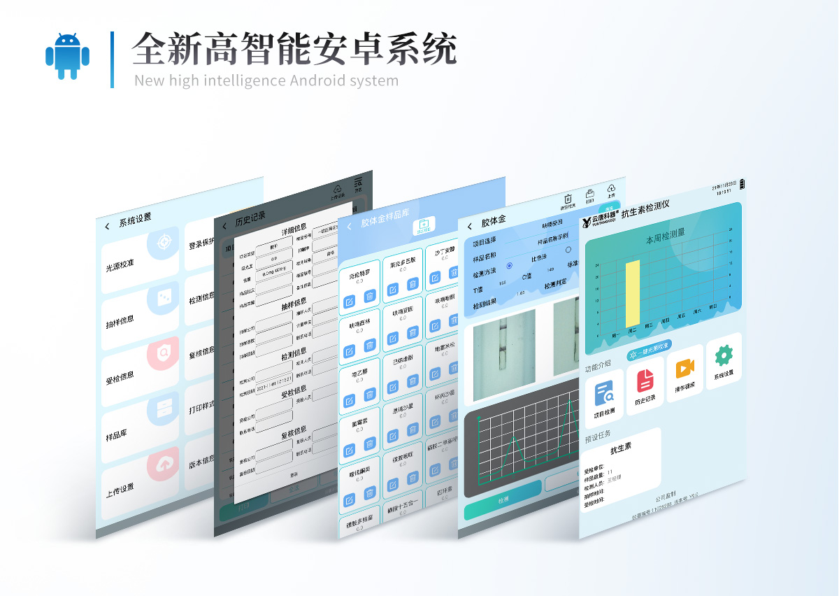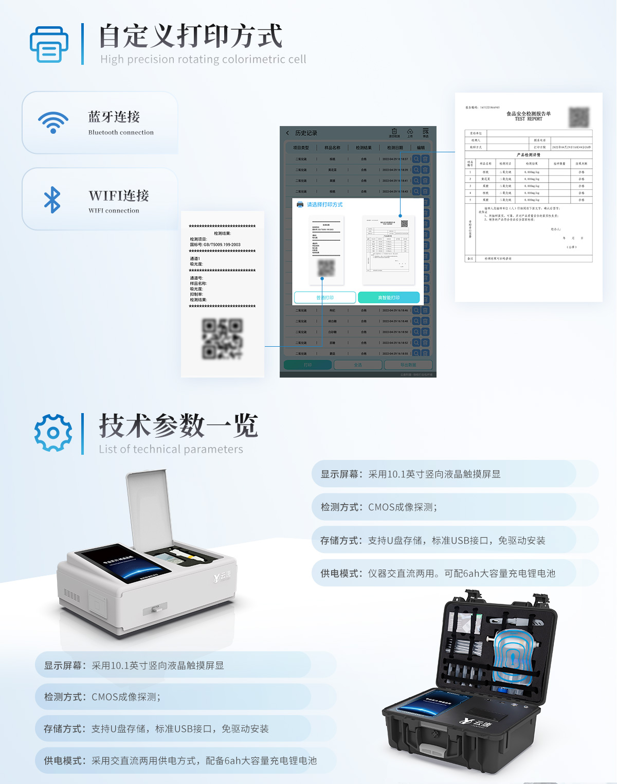 | 儀器采用10.1英寸液晶觸摸屏顯,搭配運(yùn)行安卓智能操作系統(tǒng),主控芯片采用ARM Cortex-A7,RK3288/4核處理器,主頻1.88Ghz,運(yùn)轉(zhuǎn)速度更快速,性能更強(qiáng)。 | 儀器功能包括:膠體金檢測模塊、數(shù)字化管理模塊、無線通訊模塊等,可以滿足同一軟件下實(shí)現(xiàn)所有檢測項(xiàng)目的檢測,并在同一窗口展示檢測結(jié)果。 | 一體化便攜式快檢設(shè)備,采用交直流兩用供電方式,可連接車載電源,配備6ah大容量充電鋰電池,可以滿足現(xiàn)場及流動檢測使用的需求。儀器尺寸:43×35×20cm, 主機(jī)凈重:5.1kg | 系統(tǒng)自帶數(shù)據(jù)集成模塊,設(shè)備首頁自動統(tǒng)計(jì)檢測數(shù)據(jù)包含:周檢測數(shù)據(jù)、月檢測數(shù)據(jù),全部檢測總數(shù)量,均包含檢測總數(shù),合格數(shù),不合格數(shù),以及相關(guān)柱形分析圖,對各項(xiàng)檢測數(shù)據(jù)清晰掌握,無需電腦查詢,更加快捷直觀。 | 儀器具有任務(wù)預(yù)設(shè)模塊,可在樣品送檢前提前預(yù)設(shè)樣品名稱、檢測指標(biāo)、送檢單位等信息,樣品送檢時(shí)一鍵調(diào)取保存信息,檢測更加方便快捷。 | 軌道式自動傳輸掃描方式,可實(shí)時(shí)顯示金標(biāo)卡實(shí)時(shí)圖像,系統(tǒng)自動分析并呈現(xiàn)出CT曲線圖,CT線自動識別,無需手動調(diào)整,完成檢測后自動退出檢測卡。 | 結(jié)果判定線可修改,對照值標(biāo)定值可保存,斷電不丟失數(shù)據(jù)。 | 兼容市場上其他膠體金卡,使用耗材不受限制,極大增強(qiáng)用戶使用體驗(yàn)。 | 儀器檢測系統(tǒng)擁有龐大數(shù)據(jù)庫,并且構(gòu)建了完善的檢索、修訂功能。食品庫涵蓋多種樣品名稱,可按需添加或刪除、編輯樣品名稱;產(chǎn)品數(shù)據(jù)庫以及歷史檢測記錄支持一鍵檢索功能。 | 系統(tǒng)打印自定義化,打印格式多樣化,產(chǎn)品合格證(國家標(biāo)準(zhǔn)要求),二維碼,抽樣信息、檢測信息,受檢信息、復(fù)核信息、抽樣日期、檢測日期等信息結(jié)果,可按需求自行設(shè)置打印內(nèi)容。 | A4紙版本報(bào)告打印功能(可選配):設(shè)備擁有兩種結(jié)果展示方式,可以自動生成A4打印模板和小票打印模板兩種樣式,可通過WiFi及網(wǎng)線等方式鏈接外置打印機(jī)可進(jìn)行打印 | 儀器具有 wifi 聯(lián)網(wǎng)上傳、RJ45網(wǎng)線連接功能,可以快速上傳數(shù)據(jù)。同步對接監(jiān)管平臺,數(shù)據(jù)可局域網(wǎng)和互聯(lián)網(wǎng)數(shù)據(jù)上傳,檢測結(jié)果直接傳至食品安全監(jiān)管平臺。進(jìn)行區(qū)域食品安全監(jiān)管及大數(shù)據(jù)分析處理與數(shù)據(jù)統(tǒng)計(jì),檢測區(qū)域食品安全長短期動態(tài),達(dá)到食品安全問題預(yù)估、預(yù)警。 | 設(shè)備支持U盤存儲,標(biāo)準(zhǔn)USB接口,免驅(qū)動安裝。檢測結(jié)果存儲容量20萬條以上,可生成Excel表格,進(jìn)行一鍵拷貝,并具有登錄保護(hù)功能,可設(shè)置用戶名及密碼,規(guī)范不同人員操作權(quán)限,防止非工作人員操作,并且可以進(jìn)行重新校準(zhǔn)、鎖定、恢復(fù)出廠設(shè)置功能。儀器固件可升級,后期檢測項(xiàng)目可擴(kuò)充。 | 儀器具有重新校準(zhǔn)、鎖定、恢復(fù)出廠設(shè)置功能。 | 儀器具備遠(yuǎn)程升級功能,可定向分客戶分儀器更新,開機(jī)后自動更新,并可持續(xù)性免費(fèi)更新系統(tǒng)版本,無需像傳統(tǒng)產(chǎn)品返廠更新,節(jié)省時(shí)間及人力成本并避免了物流運(yùn)輸返廠升級導(dǎo)致設(shè)備損壞的潛在風(fēng)險(xiǎn)。 |