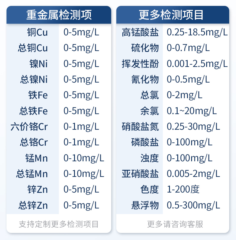 提取一定量水體樣品,經過前處理后根據不同檢測項目按照試劑說明書滴入檢測試劑,檢測試劑會與水體中的待測物質發生反應,反應液呈現特定的顏色。