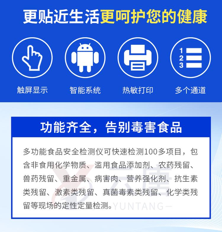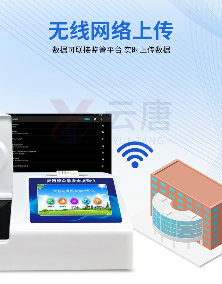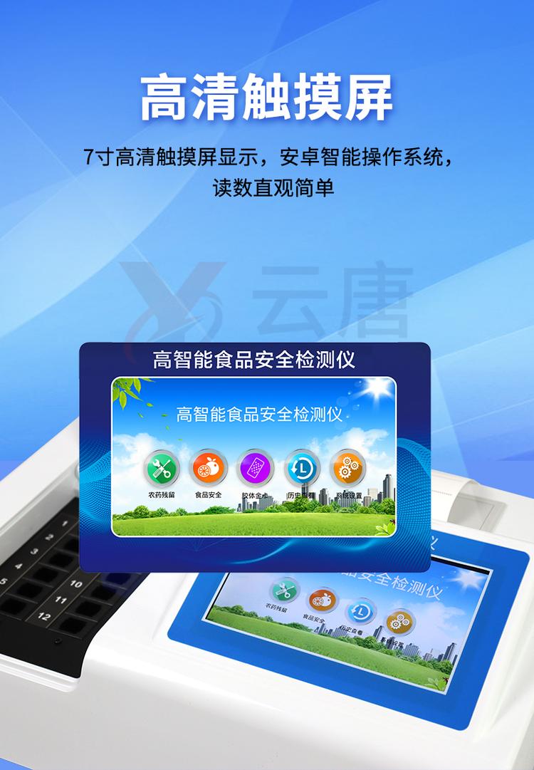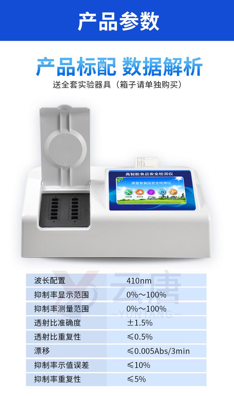 | 儀器采用臺式一體化系統(tǒng)檢測技術(shù),將分光光度模塊、新型農(nóng)殘檢測模塊、數(shù)字化管理模塊、無線通訊模塊高度集成于一體,支持檢測200種食品安全檢測項目,同時預(yù)留升級檢測方法。 | 儀器檢測模塊標(biāo)準(zhǔn)化、智能化,可隨意自由組合。檢測箱體內(nèi)置多個標(biāo)準(zhǔn)檢測單元,檢測模塊可以調(diào)整配置。 | 儀器采用全新安卓智能系統(tǒng),主控芯片采用 ARM Cortex-A7,RK3288/4核處理器,10.1寸高清液晶觸摸豎屏,更加**的UI交互界面,運轉(zhuǎn)快捷;儀器配備無線通信模塊: 4G(APN)通訊模塊、Wifi模塊,藍牙傳輸,同時具有雙USB接口以及RJ45接口能以多種方式實現(xiàn)數(shù)據(jù)保存和數(shù)據(jù)傳輸功能。 | 創(chuàng)新檢測模式: | ★檢測通道:≥12通道;采用精密旋轉(zhuǎn)比色池設(shè)計,使用同芯片同光源校準(zhǔn)精度,解決不同光源之間的誤差值。1-12通道間誤差0.1%。(***:**202022821055.2) | ★儀器具有自動識別比色皿檢測功能,即:將樣品比色皿放入儀器后,點擊樣品檢測,儀器自動識別比色皿進行通道檢測。 | 進口高精光源: | 高精度進口四波長冷光源,通道配置 410、520、590、630nm 波長光源,一個光源芯片驅(qū)動一個光源,誤差極小,每臺設(shè)備單獨**校準(zhǔn)光源,**比對,同時參照四種不同波段光源全方位覆蓋市面上99%的農(nóng)殘食品項目檢測。 | 智能化操作系統(tǒng): | 便捷操作系統(tǒng):設(shè)備檢測時可在同一檢測界面自動對應(yīng)相關(guān)檢測通道一次性選擇1-12個樣品名稱,無須退出界面,節(jié)省操作時間。 | 數(shù)據(jù)集成系統(tǒng):設(shè)備首頁自動統(tǒng)計檢測數(shù)據(jù)包含:周檢測數(shù)據(jù)、月檢測數(shù)據(jù),全部檢測總數(shù)量,均包含檢測總數(shù),合格數(shù),不合格數(shù),以及相關(guān)柱形分析圖,對各項檢測數(shù)據(jù)清晰掌握,無需電腦查詢,更加快捷直觀。 | 項目預(yù)設(shè)系統(tǒng):支持添加單個及多個相同或不相同的任務(wù)預(yù)設(shè),一鍵快速調(diào)取,每一個任務(wù)分別可以設(shè)置不同的樣品、批次、編號、來源、備注、抽樣信息、檢測信息、受檢信息、復(fù)核信息等更多信息。無縫鏈接平臺和APP實時查看下發(fā)任務(wù)。 | 數(shù)據(jù)監(jiān)管系統(tǒng):同步對接監(jiān)管平臺,數(shù)據(jù)可局域網(wǎng)和互聯(lián)網(wǎng)數(shù)據(jù)上傳,檢測結(jié)果可選擇直接傳至食品安全監(jiān)管平臺。集成OSS輸出存儲服務(wù)、區(qū)分設(shè)備定向管理應(yīng)用,進行區(qū)域食品安全監(jiān)管及大數(shù)據(jù)分析處理與數(shù)據(jù)統(tǒng)計,檢測區(qū)域食品安全長短期動態(tài),達到食品安全問題預(yù)估、預(yù)警。 | 自定義打印系統(tǒng):內(nèi)置全新打印系統(tǒng),新創(chuàng)自定義打印方式,可按需靈活設(shè)置開啟或關(guān)閉:產(chǎn)品合格證(國家農(nóng)業(yè)部標(biāo)準(zhǔn)要求),二維碼,抽樣信息、檢測信息,受檢信息、復(fù)核信息、抽樣日期、檢測日期等信息的打印。 | 系統(tǒng)遠程更新功能:可定向分客戶分儀器更新系統(tǒng),按照不同客戶后期實際需求添加項目,無需機器返廠,即可遠程實時升級全新系統(tǒng),節(jié)省時間成本及避免運輸造成設(shè)備損壞。 | 儀器主機采用一體化防水、抗壓、防撞擊、防腐蝕箱體設(shè)計,同時配備交直流供電,可連接車載電源,可選配大容量充電鋰電池,滿足現(xiàn)場野外檢測需求。 | 安全證書,放心保障:儀器具有中國計量科學(xué)研究院校準(zhǔn)證書,權(quán)威認(rèn)證。 |