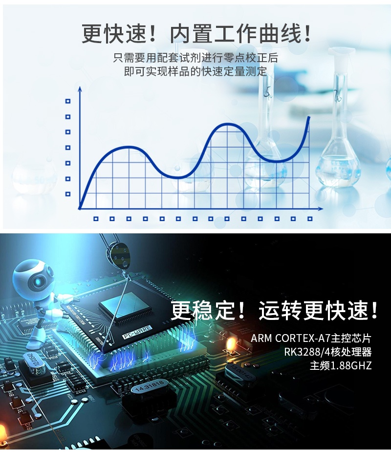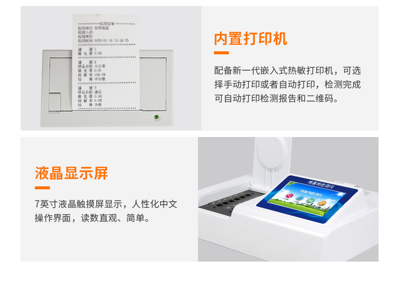 儀器采用臺式一體化系統檢測技術,將分光光度模塊、新型農殘檢測模塊、數字化管理模塊、無線通訊模塊高度集成于一體,支持檢測200種食品安全檢測項目,同時預留升級檢測方法。儀器檢測模塊標準化、智能化,可隨意自由組合。檢測箱體內置多個標準檢測單元,檢測模塊可以調整配置。儀器采用全新安卓智能系統,主控芯片采用 ARM Cortex-A7,RK3288/4核處理器,10.1寸高清液晶觸摸豎屏,更加**的UI交互界面,運轉快捷;儀器配備無線通信模塊: 4G(APN)通訊模塊、Wifi模塊,藍牙傳輸,同時具有雙USB接口以及RJ45接口能以多種方式實現數據保存和數據傳輸功能。創新檢測模式:★檢測通道:≥12通道;采用精密旋轉比色池設計,使用同芯片同光源校準精度,解決不同光源之間的誤差值。1-12通道間誤差0.1%。(***:**202022821055.2)★儀器具有自動識別比色皿檢測功能,即:將樣品比色皿放入儀器后,點擊樣品檢測,儀器自動識別比色皿進行通道檢測。進口高精光源:高精度進口四波長冷光源,通道配置 410、520、590、630nm 波長光源,一個光源芯片驅動一個光源,誤差極小,每臺設備單獨**校準光源,**比對,同時參照四種不同波段光源全方位覆蓋市面上99%的農殘食品項目檢測。智能化操作系統:便捷操作系統:設備檢測時可在同一檢測界面自動對應相關檢測通道一次性選擇1-12個樣品名稱,無須退出界面,節省操作時間。數據集成系統:設備首頁自動統計檢測數據包含:周檢測數據、月檢測數據,全部檢測總數量,均包含檢測總數,合格數,不合格數,以及相關柱形分析圖,對各項檢測數據清晰掌握,無需電腦查詢,更加快捷直觀。項目預設系統:支持添加單個及多個相同或不相同的任務預設,一鍵快速調取,每一個任務分別可以設置不同的樣品、批次、編號、來源、備注、抽樣信息、檢測信息、受檢信息、復核信息等更多信息。無縫鏈接平臺和APP實時查看下發任務。數據監管系統:同步對接監管平臺,數據可局域網和互聯網數據上傳,檢測結果可選擇直接傳至食品安全監管平臺。集成OSS輸出存儲服務、區分設備定向管理應用,進行區域食品安全監管及大數據分析處理與數據統計,檢測區域食品安全長短期動態,達到食品安全問題預估、預警。自定義打印系統:內置全新打印系統,新創自定義打印方式,可按需靈活設置開啟或關閉:產品合格證(國家農業部標準要求),二維碼,抽樣信息、檢測信息,受檢信息、復核信息、抽樣日期、檢測日期等信息的打印。系統遠程更新功能:可定向分客戶分儀器更新系統,按照不同客戶后期實際需求添加項目,無需機器返廠,即可遠程實時升級全新系統,節省時間成本及避免運輸造成設備損壞。儀器主機采用一體化防水、抗壓、防撞擊、防腐蝕箱體設計,同時配備交直流供電,可連接車載電源,可選配大容量充電鋰電池,滿足現場野外檢測需求。安全證書,放心保障:儀器具有中國計量科學研究院校準證書,權威認證。