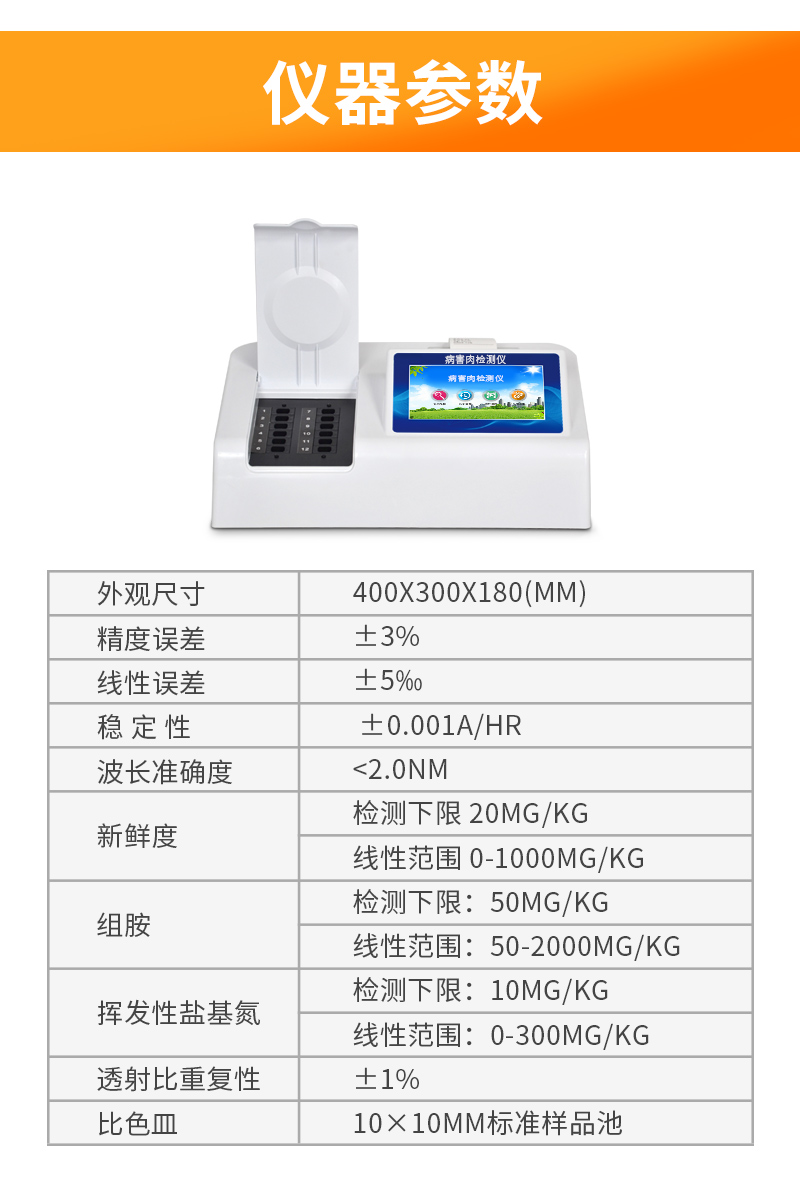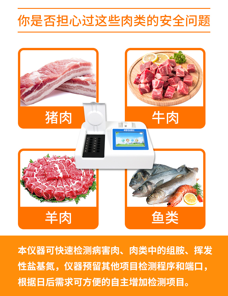 可快速檢測病害肉、組胺、揮發性鹽基氮,儀器預留其他項目檢測程序和端口,根據日后需求可方便的自主增加檢測項目。