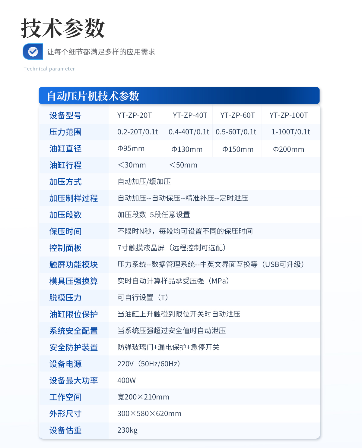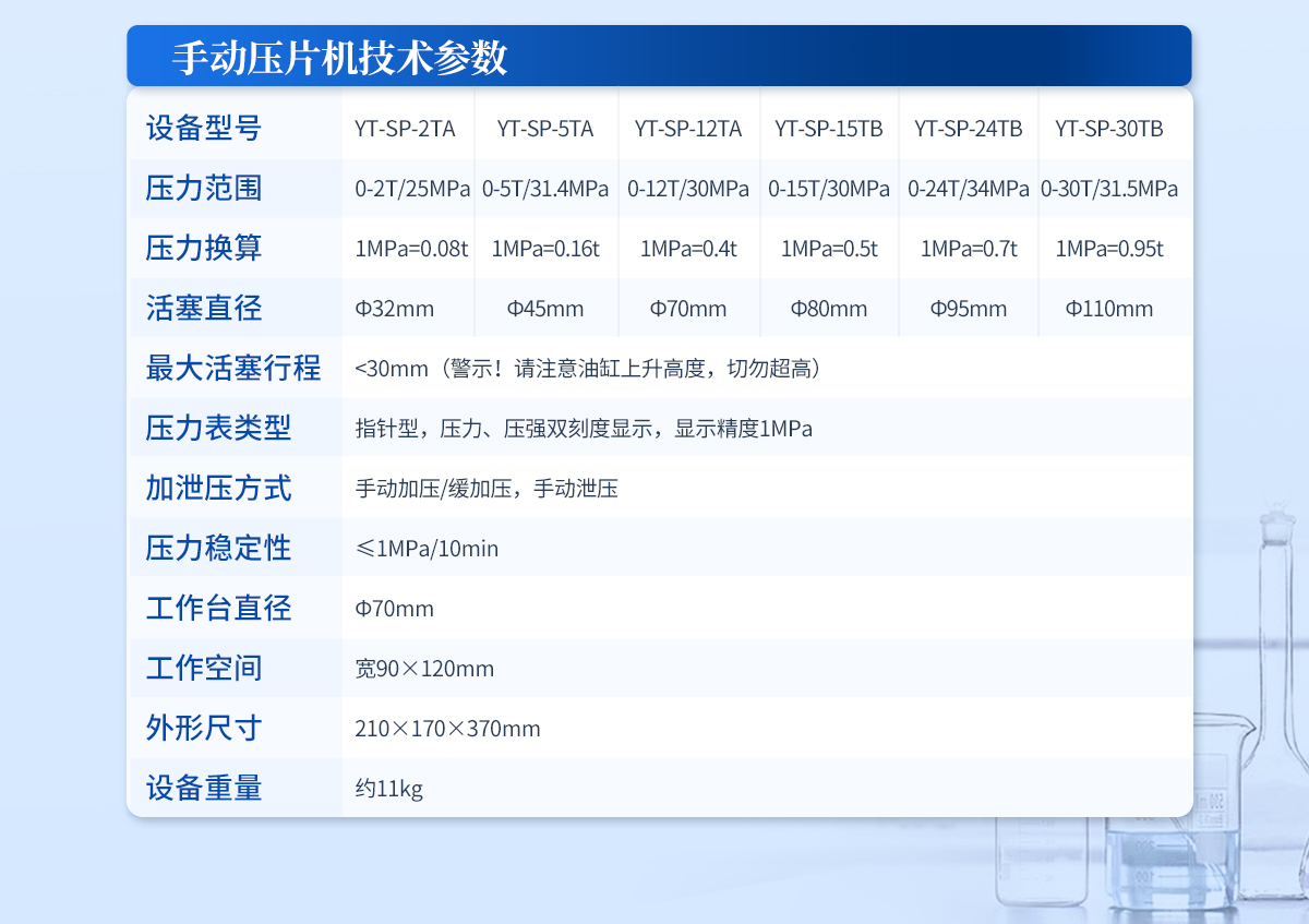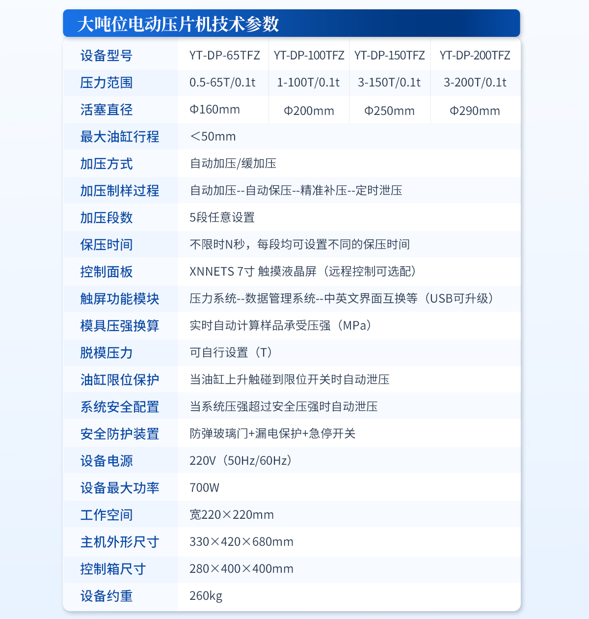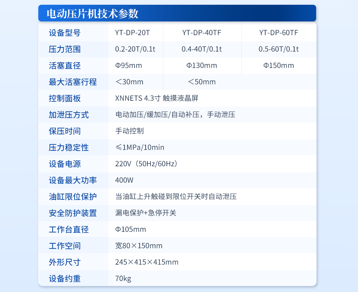 | 設備型號:YT-DP-65TFZ | 壓力范圍:0.5-65T/0.1t | 油缸直徑:Φ160mm | 油缸行程 :<50mm | 加壓方式:自動加壓/緩加壓 | 加壓制樣過程:自動加壓--自動保壓--精準補壓--定時泄壓 | 加壓段數:5段任意設置 | 保壓時間:不限時N秒,每段均可設置不同的保壓時間 | 控制面板:XNNETS 7寸 觸摸液晶屏(遠程控制可選配) | 觸屏功能模塊:壓力系統--數據管理系統--中英文界面互換等(USB可升級) | 模具壓強換算:實時自動計算樣品承受壓強(MPa) | 脫模壓力:可自行設置(T) | 油缸限位保護:當油缸上升觸碰到限位開關時自動泄壓 | 系統安全配置:當系統壓強超過安全值時自動泄壓 | 安全防護裝置:防彈玻璃門+漏電保護+急停開關 | 設備電源:220V(50Hz/60Hz) | 設備**功率:700W | 工作空間:寬220×220mm | 主機外形尺寸:330×420×680mm | 控制箱尺寸:280×400×400mm | 設備約重 :260kg | 配置說明:主機1臺,控制箱1臺!模具選配!可根據需求定制壓片機或模具 |