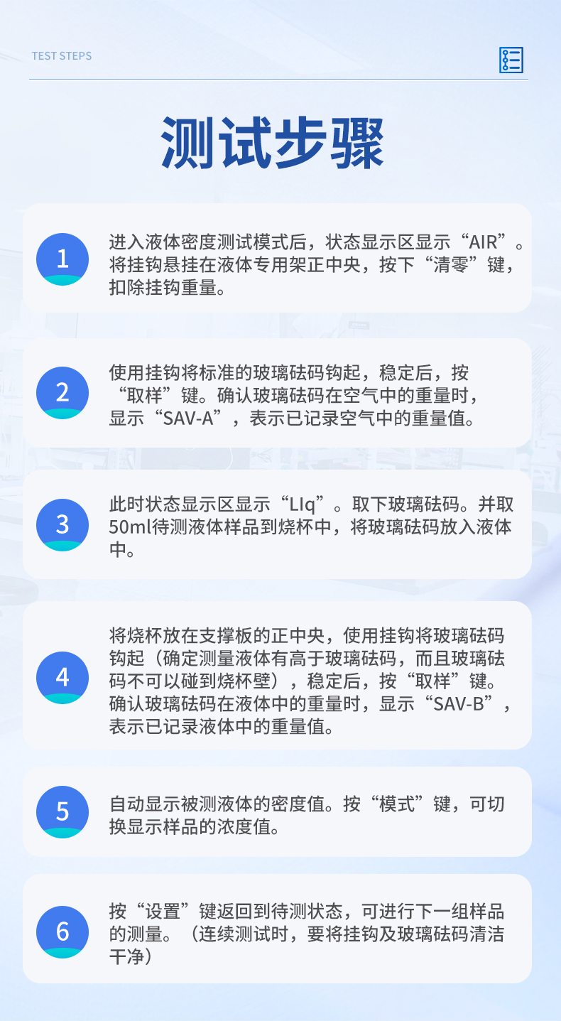 1、進入液體密度測試模式后,狀態顯示區顯示“AIR”。 將掛鉤懸掛在液體專用架正中央,按下“清零”鍵,扣除掛鉤重量。2、使用掛鉤將標準的玻璃砝碼鉤起,穩定后,按“取樣”鍵。確認玻璃砝碼在空氣中的重量時,顯示“SAV-A”,表示已記錄空氣中的重量值。3、此時狀態顯示區顯示“LIq”。取下玻璃砝碼。并取50ml待測液體樣品到燒杯中,將玻璃砝碼放入液體中。4、將燒杯放在支撐板的正中央,使用掛鉤將玻璃砝碼鉤起(確定測量液體有高于玻璃砝碼,而且玻璃砝碼不可以碰到燒杯壁),穩定后,按“取樣”鍵。確認玻璃砝碼在液體中的重量時,顯示“SAV-B”,表示已記錄液體中的重量值。5、自動顯示被測液體的密度值。按“模式”鍵,可切換顯示樣品的濃度值。7、按“設置”鍵返回到待測狀態,可進行下一組樣品的測量。(連續測試時,要將掛鉤及玻璃砝碼清潔干凈)儀器尺寸:195*220*190mm包裝尺寸:430*200*360mm包裝重量:4kg