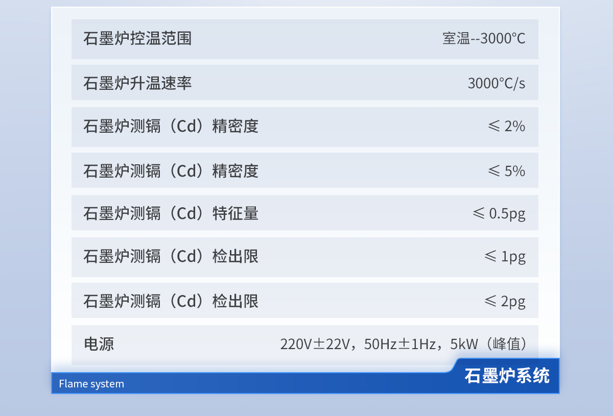 波長范圍:185nm~900nm 自動尋峰設置單色器類型:切爾尼-特納型(Czerny-Turner 型) 光譜帶寬:0.1/0.2/0.4/0.7/1.4 nm 五檔自動切換 光柵閃耀波長:230nm 光柵刻線:1800 線/mm 波長準確度:≤±0.2nm 波長重復性:< 0.10nm 分辨率:優于 0.3nm 靜態基線穩定性:0.003 Abs(static) 氘燈背景校正能力:60 倍以上 石墨爐控溫范圍:室溫--3000℃ 石墨爐升溫速率:3000℃/s 石墨爐測鎘(Cd)精密度:≤ 2% 石墨爐測鎘(Cd)特征量:≤ 0.5pg 石墨爐測鎘(Cd)檢出限:≤ 1pg 電源:220V±22V,50Hz±1Hz,5kW(峰值)