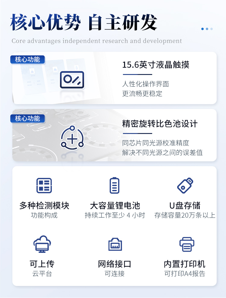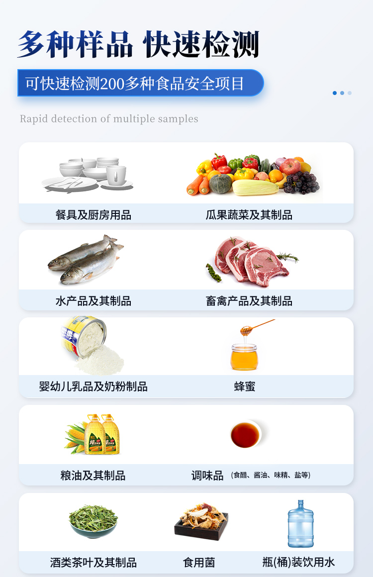 | 儀器采用臺式一體化系統檢測技術,將分光光度模塊、數字化管理模塊、無線通訊模塊高度集成于一體,可支持檢測60種食品安全檢測項目,同時預留升級檢測方法。 | 儀器檢測模塊標準化、智能化,檢測項目可隨意自由組合。檢測箱體內置多個標準檢測單元,檢測模塊可以調整配置。 | 儀器采用全新安卓智能系統,主控芯片采用 ARM Cortex-A7,RK3288/4核處理器,10.1寸高清液晶觸摸豎屏,更加**的UI交互界面,運轉快捷;儀器配備無線通信模塊: 4G(APN)通訊模塊、Wifi模塊,藍牙傳輸,同時具有雙USB接口以及RJ45接口能以多種方式實現數據保存和數據傳輸功能。 | 顯示屏幕:儀器采用10.1英寸豎向液晶觸摸屏顯,搭配運行安卓智能操作系統,主控芯片采用ARM Cortex-A7,RK3288/4核處理器,主頻1.88Ghz,操作方便,性能更強。 | 檢測通道:≥12通道;采用精密旋轉比色池設計,使用同芯片同光源校準精度,解決不同光源之間的誤差值,更加準確**。(1-12通道間誤差0.1%,***:**202022821055.2) | 儀器光源:高精度進口四波長冷光源,每個通道均配置 410、520、590、630nm 波長光源,標配**的光路切換裝置,專利光路切換功能可實現64波長,并且所有檢測項目可實現所有通道同時檢測。 | 設備可一鍵校準,自動保存校準數據,自動對比校驗,得到精準光源,采用Android SP存儲數據,光源數據永不丟失,方便每一次使用。 | 通訊接口:配備無線通信模塊、4G(APN)通訊模塊、藍牙傳輸,同時具有雙USB接口以及RJ45網線接口,可以多方式實現數據保存及數據傳輸。 | 存儲方式:支持U盤存儲,標準USB接口,免驅動安裝。檢測結果存儲容量20萬條以上,可生成Excel表格進行拷貝,并具有登錄保護功能。 | 智能化操作系統: | 1、操作系統:儀器可在同一檢測界面自動對應相關檢測通道,一次性選擇1-12個樣品名稱,無需退出界面,節省操作時間。并可以對每個通道屬性和樣品信息單獨進行編輯,例如送檢單位、人員,檢測人員等,打印時勾選打印顯示。 | 2、數據集成系統:設備首頁自動匯總分析檢測數據,包含:周檢測數據、月檢測數據,全部檢測總數量,均包含檢測總數,合格數,不合格數,以及相關柱形分析圖,各項檢測數據一目了然,無需電腦查詢,更加快捷直觀。 | 3、數據庫系統:十幾項數據庫分類管理儀器:包含項目類型、項目數據、檢測數據、歷史記錄、國標信息、曲線信息、采樣信息、檢測信息、受檢信息、復核信息、圖表信息、光源校準信息、打印樣式信息、樣品庫信息等等,數據庫之間互相協調聯動保證數據的真實完整性。同時產品數據庫以及歷史檢測記錄支持一鍵檢索功能。 | 4、限量規判系統:具有限量查詢、添加物質合規判定系統。檢測出結果后,系統自動調用系統數據庫中相關國標進行比對判定,客觀顯示判定結果是否合格。 | 5、項目預設系統:儀器具有任務預設模塊,一鍵提前預設,給出方便快捷的新檢測方案,每一個任務分別可以設置不同的樣品、批次、編號、來源、備注、抽樣信息、檢測信息、受檢信息、復核信息等更多信息。樣品送檢時一鍵調取保存信息,并可多次調取,大大提高檢測效率。 | 6、數據監管系統:同步對接監管平臺,數據可局域網和互聯網數據上傳,檢測結果可選擇直接傳至食品安全監管平臺。進行區域食品安全監管及大數據分析處理與數據統計,檢測區域食品安全長短期動態,達到食品安全問題預估、預警。 | 7、全新打印系統:內置全新打印機,新創自定義打印方式,可按需靈活勾選控制:二維碼,抽樣信息、檢測信息,受檢信息、復核信息、抽樣日期、檢測日期等信息的打印。 | 8、A4紙版本報告打印功能(可選配):設備擁有兩種結果展示方式,可以自動生成A4打印模板和小票打印模板兩種樣式,可通過WiFi及網線等方式鏈接外置打印機可進行打印。 | 供電模式:儀器交直流兩用,直流12V供電,可連接車載電源,可配6ah大容量充電鋰電池,電量可實時顯示,方便戶外流動測試。 | 儀器具備遠程升級功能,可定向分客戶分儀器更新,開機后自動更新,并可持續性免費更新系統版本,無需像傳統產品返廠更新,節省時間及人力成本并避免了物流運輸返廠升級導致設備損壞的潛在風險。 |