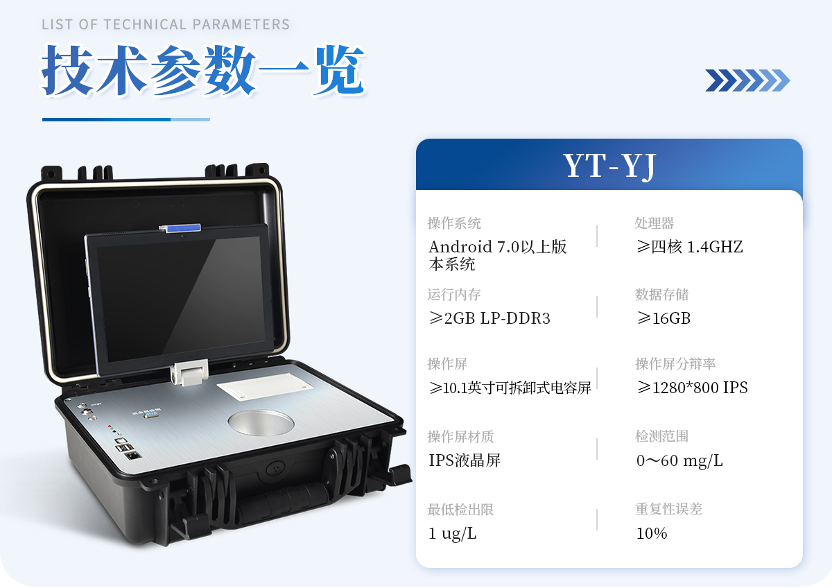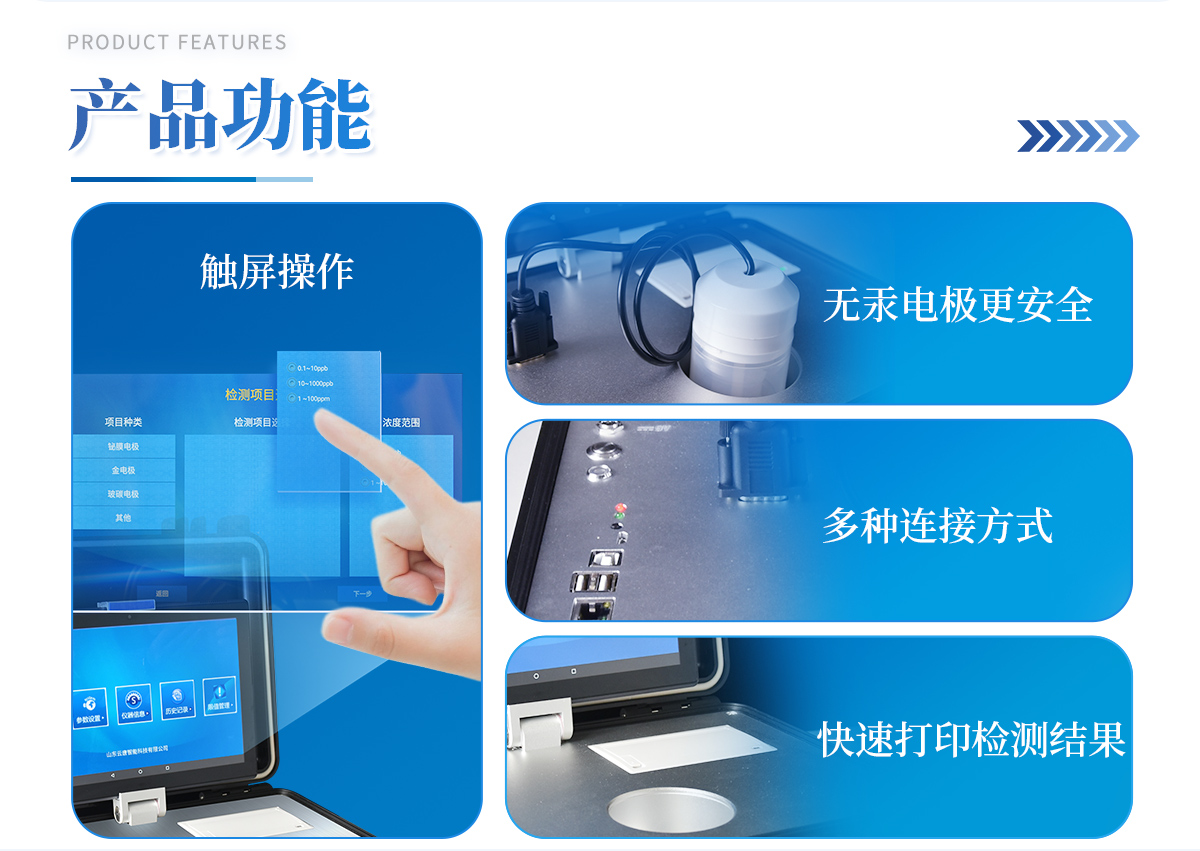 基本概述:便攜式箱體化一體機,采用防水、抗壓、防撞擊、防腐蝕箱體設計,滿足車載環境、無電源環境以及戶外檢測需求;主機:具備檢測功能、輔助功能、管理系統軟件、信息化管理功能,信息化實現數據雙向傳輸,能直接接收管理中心下發任務,并實時上報檢測結果至管理平臺;檢測技術:采用陽極溶出伏安法檢測技術;操作系統:Android 7.0以上版本系統;處理器:≥四核 1.4GHZ;運行內存:≥2GB LP-DDR3;數據存儲:≥16GB;通訊接口:包含兩個USB接口、網線接口、WIFI、藍牙、4G模塊,內置GPS接口,用于戶外或者其他移動檢測定位;指示燈:具有熱敏打印機工作指示燈,用于提示打印機工作狀態;具有電源充電指示燈,用于提示儀器充電狀態;具有無線藍牙對接狀態提示燈,用于提示操作平臺與儀器主機連接狀態;具有儀器工作狀態提示燈,用于提示儀器主機是否處于工作狀態;操作屏:≥10.1英寸可拆卸式電容屏設計,操作屏可以固定在儀器上,也可以取出單獨操作實現運程控制;操作屏分辯率:≥1280*800 IPS;操作屏材質:  IPS液晶屏;輸入方式: 電容屏、觸摸輸入、支持多點觸控;采用無汞電極,安全無毒;模塊自帶攪拌功能,啟動后既可自動攪拌溶液。檢測范圍: 0~60 mg/L ,**檢出限:1 ug/L;重復性誤差: 10%;具有自動尋峰功能,計算出樣品**數據;內置線性掃描、常規脈沖掃描、微分脈沖掃描;儀器現場取證功能: 儀器具有800萬以上防抖、自動對焦高清攝像頭,對檢測實樣進行現場拍照取證;電源控制器: 雙電源控制器,節省電量;運程控制:支持20米內無線藍牙控制儀器檢測,方便使用者沒在儀器身邊時也能完成項目檢測;打印: 內置微型熱敏打印機,可隨時打印檢測結果;電池:內置大容量可充電鋰電池,可連續工作5小時以上;箱體: 便攜一體化手提箱,箱體能防水,抗壓,整機重量小于5kg,攜帶方便;