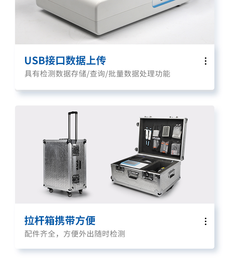 | 一體化設計,集成孵育和檢測功能同時進行,孵育完成直接檢測; | 全中文 7英寸高清液晶顯示,觸摸屏操作; | Android 系統,支持在線升級,可WIFI聯網; | 檢測原理:熒光定量免疫層析法; | 6通道設計,可同時進行一種或多種指標的檢測,6個獨立檢測單元,檢測效率高,并且互不干擾; | 具有二維碼自動識別系統,可直接識別檢測項目、檢測流程等信息; | 儀器自帶熱敏打印機,檢測結果可實時打印; | 具有檢測數據存儲(存儲數量不少于 10000 條)、查詢、批量數據處理和打印功能; | 儀器≥2 個USB 接口,可拷貝結果及原始數據,具有 wifi 接入模塊,可通過無線連接網 絡實現數據上傳; | 分鐘內達到工作狀態(37℃),封閉系統,不受外界環境(光、熱)干擾,工作環境溫度:0-30℃; | 相對極差≤10%; | 重復性 CV≤1%; | 批間變異≤3%; | 尺寸310x210x93mm |