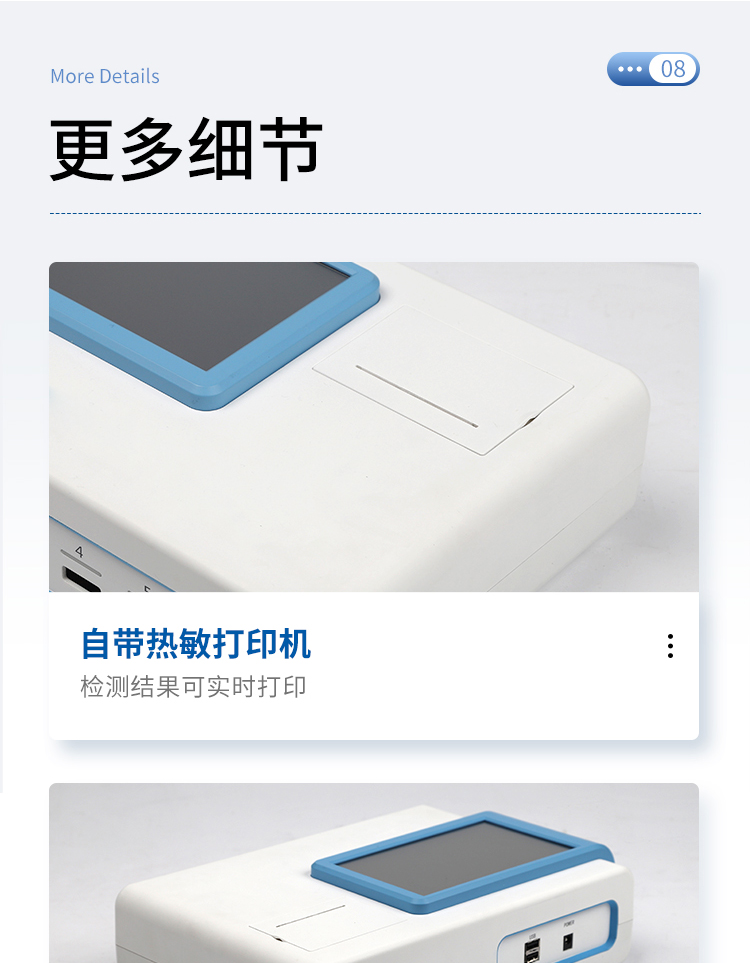 一體化設計,集成孵育和檢測功能同時進行,孵育完成直接檢測;全中文 7英寸高清液晶顯示,觸摸屏操作;Android 系統,支持在線升級,可WIFI聯網;檢測原理:熒光定量免疫層析法;6通道設計,可同時進行一種或多種指標的檢測,6個獨立檢測單元,檢測效率高,并且互不干擾;具有二維碼自動識別系統,可直接識別檢測項目、檢測流程等信息;儀器自帶熱敏打印機,檢測結果可實時打印;具有檢測數據存儲(存儲數量不少于 10000 條)、查詢、批量數據處理和打印功能;儀器≥2 個USB 接口,可拷貝結果及原始數據,具有 wifi 接入模塊,可通過無線連接網 絡實現數據上傳;分鐘內達到工作狀態(37℃),封閉系統,不受外界環境(光、熱)干擾,工作環境溫度:0-30℃;相對極差≤10%;重復性 CV≤1%;批間變異≤3%;尺寸310x210x93mm