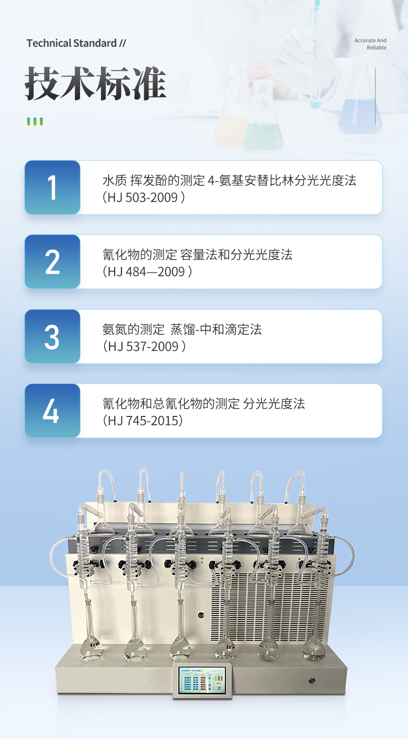 | 食品中二氧化硫殘留量、酒精度的蒸餾前處理項目 | 1.水質 揮發酚的測定 4-氨基安替比林分光光度法(HJ 503-2009 ) | 2.水質 青化物的測定 容量法和分光光度法(HJ 484—2009 ) | 3.水質 氨氮的測定 蒸餾-中和滴定法(HJ 537-2009 ) | 4.土壤 青化物和總青化物的測定 分光光度法(HJ 745-2015) |