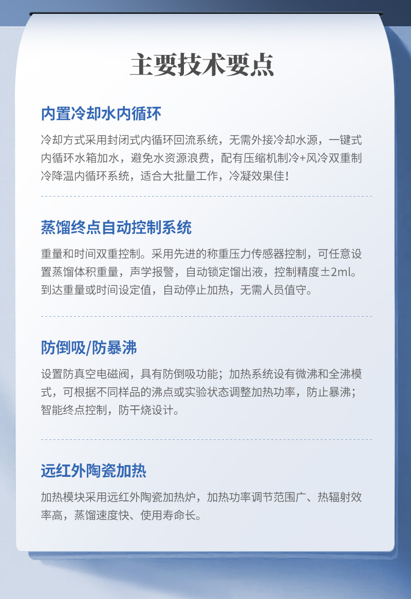 該儀器實驗了控溫、自動防倒吸、加熱均勻、防止暴沸、智能終點控制等功能。使用方便,節能環保。經過實驗室蒸餾回收率比對驗證,結果準確,回收率達95%以上。該儀器可廣泛適用于環保、疾控、水產、供排水、高校、科研院所、廠礦企業等各類化學實驗室需要蒸餾處理的場所,如揮發酚、氨氮、凱氏氮油中水分等項目的蒸餾處理。
