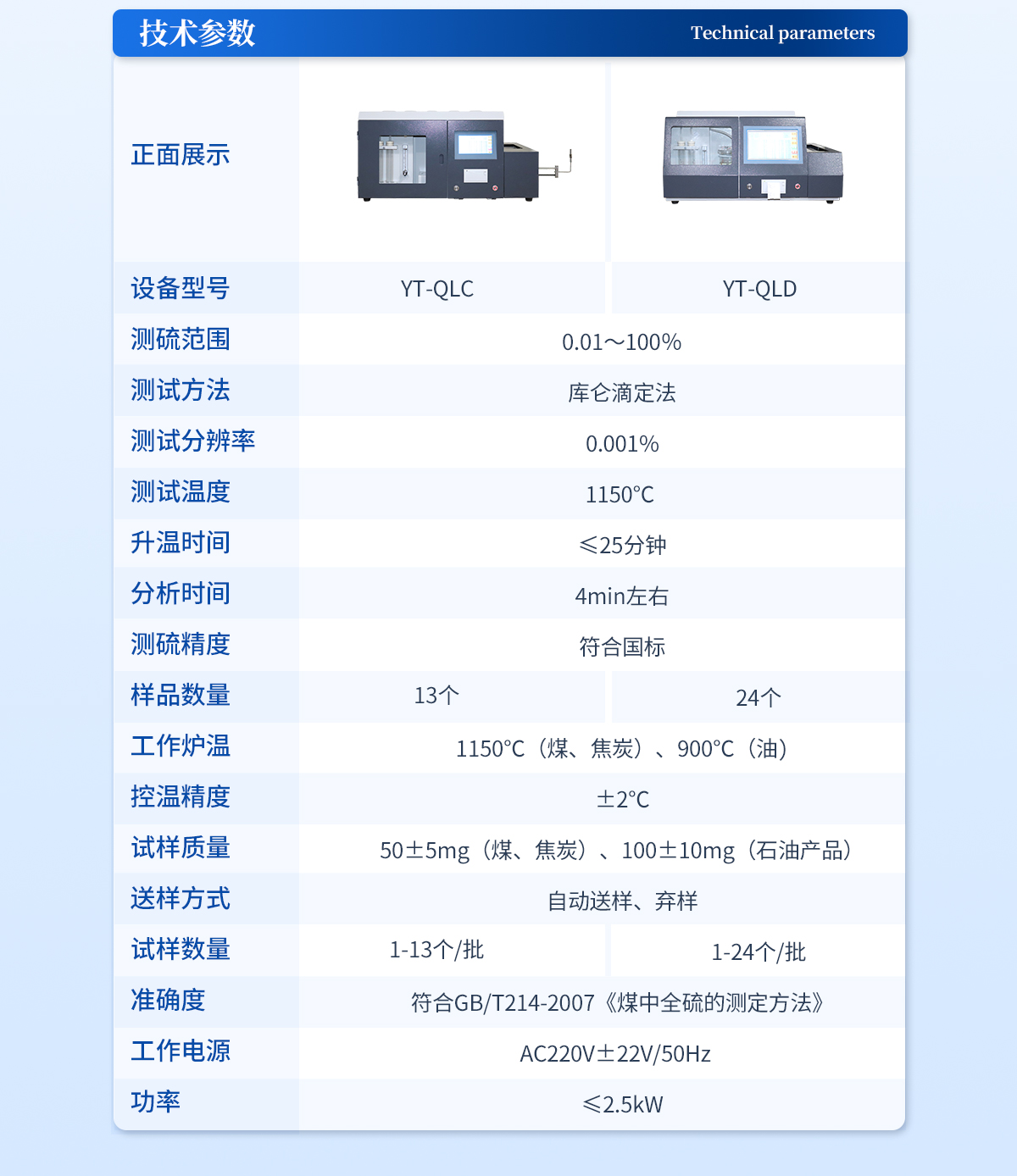 | 測硫范圍:0.01~100% | 測試方法:庫侖滴定法 | 測試分辨率:0.001% | 測試溫度:1150℃ | 升溫時間:≤25分鐘 | 分析時間:4min左右 | 測硫精度:符合國標 | 樣品數量:24個 | 工作爐溫:1150℃(煤、焦炭)、900℃(油) | 控溫精度:±2℃ | 試樣質量:50±5mg(煤、焦炭)、100±10mg(石油產品) | 送樣方式:自動送樣、棄樣 | 試樣數量:1-24個/批,試驗過程可添加/替換試樣 | 準確度:符合GB/T214-2007《煤中全硫的測定方法》 | 工作電源:AC220V±22V/50Hz 功率:≤2.5kW |